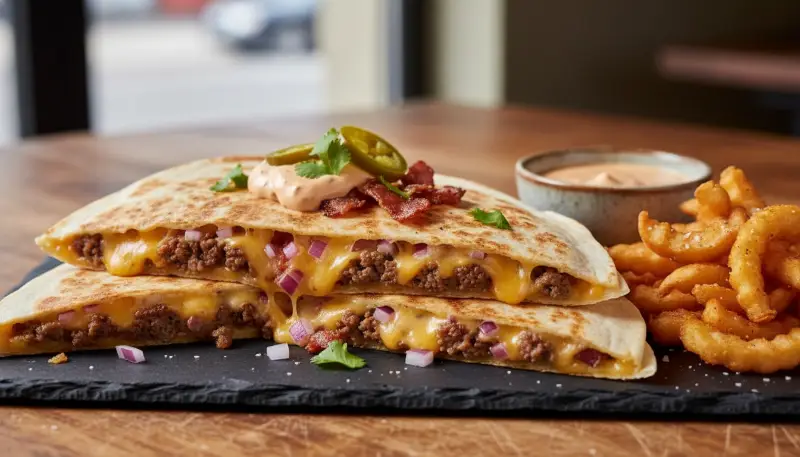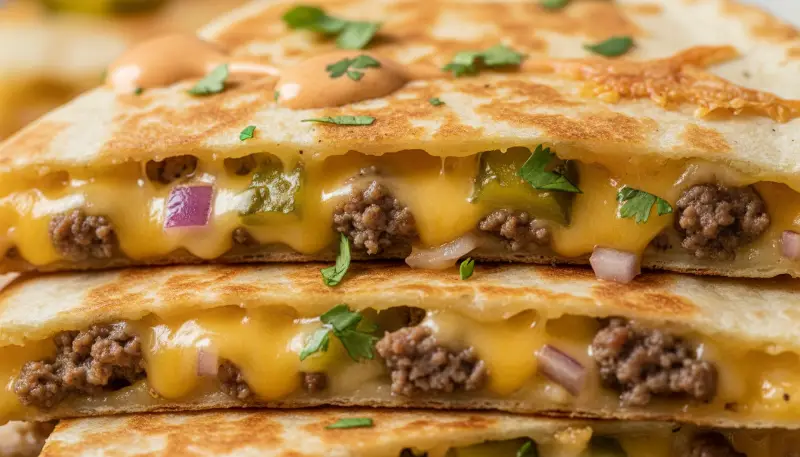 The Cheeseburger Quesadilla is the culinary intersection where American grilling meets Mexican street food. Imagine everything you love about a juicy, flame-grilled burger, the savory beef, the melty cheese, and the tangy pickles, but instead of a soft bun, it is encased in a buttery, toasted flour tortilla. This fusion dish has exploded in popularity because it solves the messiness of a traditional burger while providing a superior texture profile. The Cheeseburger Quesadilla offers a “crunch factor” that standard bread simply cannot replicate.
