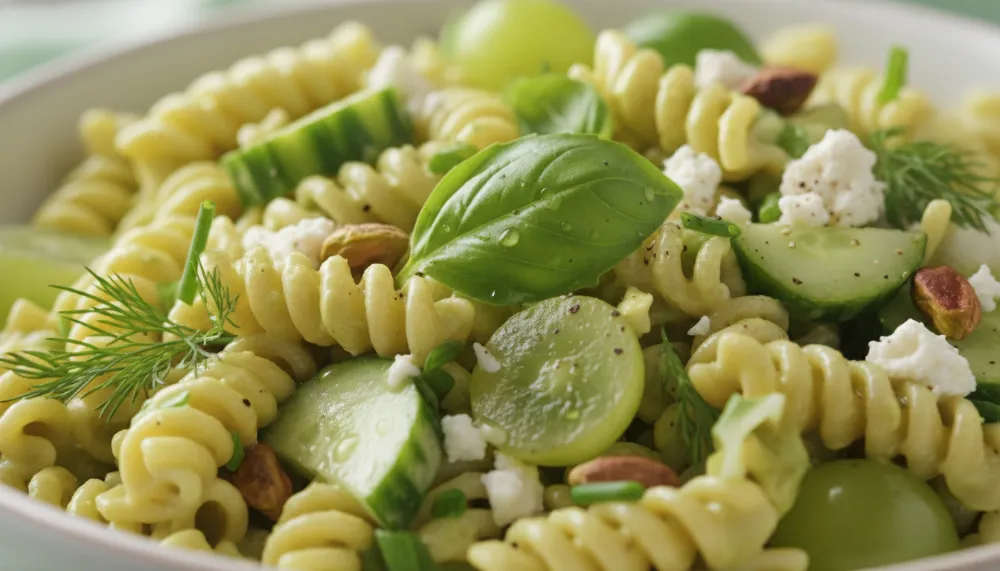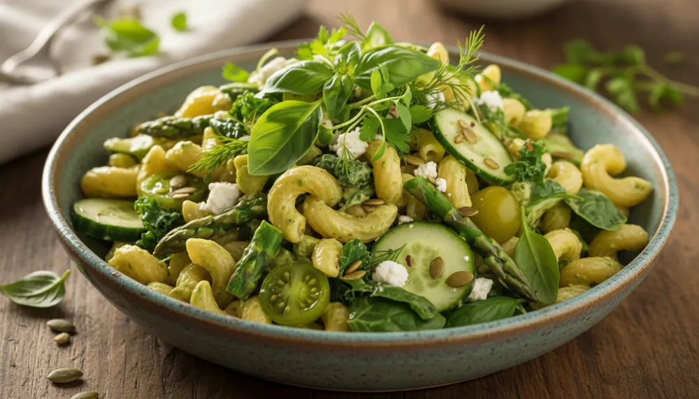 A true green goddess pasta salad should be a celebration of textures. While the pasta provides the chew and the dressing provides the creaminess, the vegetables provide the snap. Blanched asparagus and English peas are the traditional choices, but the possibilities are endless. Many professional chefs incorporate snap peas, thinly sliced cucumbers, or even blanched broccoli florets to keep the monochromatic green theme while varying the bite.