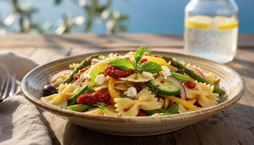 Experience the vibrant essence of the season with this Mediterranean spring pasta salad, a dish that combines crisp seasonal vegetables, hearty proteins, and a zesty, alcohol-free dressing.