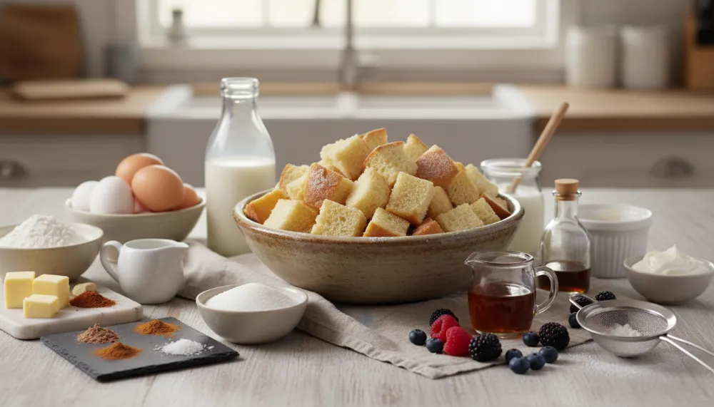 - 1 Large loaf of day-old Brioche or Challah bread, cubed