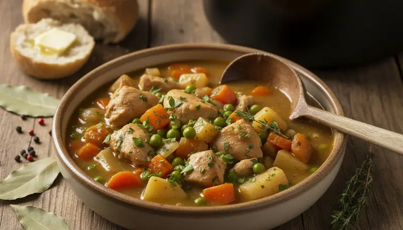 The texture of the sauce is what separates a good Slow Cooker Chicken Stew Recipe from a great one. We avoid using heavy creams or flour-based roux that can sometimes break down or become grainy over long cook times. Instead, a cornstarch slurry added in the final thirty minutes provides a silky, glossy finish that coats the back of a spoon. This ensures your Slow Cooker Chicken Stew Recipe is gluten-friendly and light while still feeling incredibly indulgent. As the slurry works its magic, the frozen peas are added, providing a pop of color and sweetness that balances the earthy tones of the thyme and rosemary.
