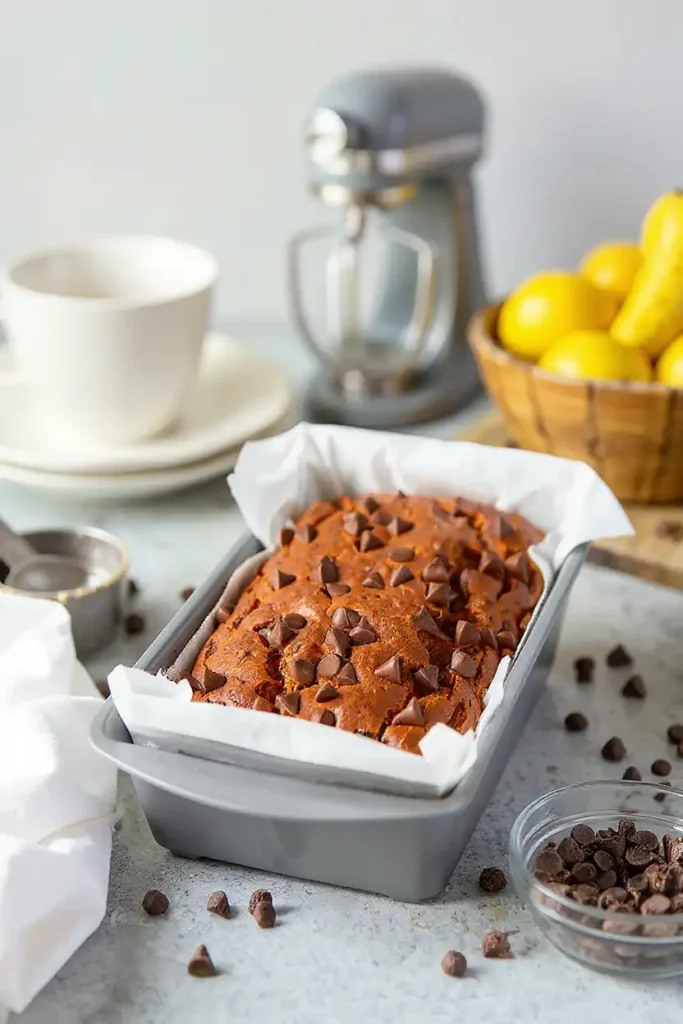 Pour the batter into your prepared loaf pan. Sprinkle extra chocolate chips on top if you like. Bake for 55–60 minutes, or until a toothpick inserted into the center comes out clean.