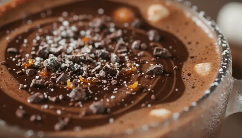 Presentation is the final step in the Gourmet Hot Chocolate Recipe journey. Serve this elixir in heavy ceramic mugs that have been pre-warmed with hot water. This ensures the temperature remains stable as you sip. The contrast of the white beef gelatin marshmallow against the dark, mahogany liquid, topped with the ruby-red garnish of a cherry or the orange of a zest strip, creates a visual feast that matches the complexity of the taste.